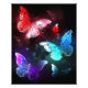 Three luminous, red, purple, green, textured, night butterflies on black luminous background.