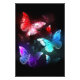 Three luminous, red, purple, green, textured, night butterflies on black luminous background.