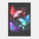 Three luminous, red, purple, green, textured, night butterflies on black luminous background.