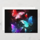 Three luminous, red, purple, green, textured, night butterflies on black luminous background.
