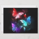 Three luminous, red, purple, green, textured, night butterflies on black luminous background.