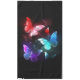 Three luminous, red, purple, green, textured, night butterflies on black luminous background.