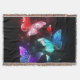 Three luminous, red, purple, green, textured, night butterflies on black luminous background.