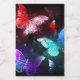 Three luminous, red, purple, green, textured, night butterflies on black luminous background.