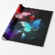 Three luminous, red, purple, green, textured, night butterflies on black luminous background.
