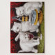 This design features an illustration by Currier and Ives. It depicts three white kittens standing on a table. One of the kittens is drinking from a glass of port wine. The other kitten has opened a tin of sardines and is happily eating a fish. The kitten in the middle appears to be jealous of the kitten that is drinking the wine and is acting aggressively. It's a cute image of pet cats enjoying themselves at a party that has been thrown by their human owners. The original artwork was completed in 1871.