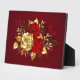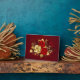 The composition of two artistically painted red roses and one golden rose, decorated with gold, jewel leaves on textured background.