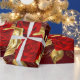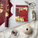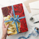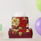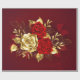 The composition of two artistically painted red roses and one golden rose, decorated with gold, jewel leaves on textured background.