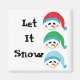 Three snowman faces each with a big grin and a carrott nose. One with a red toque, one in green and one in blue. Says Let it Snow!
