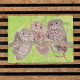 Funny, realistic acrylic painting of three super cute little, big eyed, scowling Screech owlets sitting close together on a branch, against a backdrop of bright green leaves. These cheeky young owls should melt the heart of any bird lover and bring a smile to the face of everyone else.