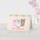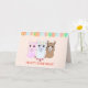 Three llamas and balloons on coral Birthday card. All texts can be personalised.