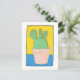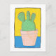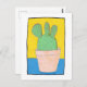 This art card has a naive art composition, hand drawn using pens and watercolour, of a cactus with three lobes on top in a flower pot. The background is yellow and blue, the pot is pinky beige and the cactus is very green with red spikes, with a thin black border and white surround. It is original and only available from The Art of Being Beth at Zazzle.
