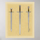 A Norman-period sword with a Brazil nut pommel, a long-bladed "Great Sword" or "Sword of War" of the 13th or 14th century, and an acutely pointed thrusting sword of the Late Middle Ages appear side-by-side in this original illustration by Richard H. Fay.