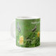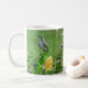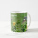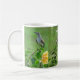 Three photographs of Mockingbirds standing on a Hibiscus bush next to a yellow flower, printed on a variety of mugs.