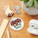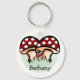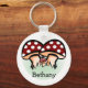 Cute keychain featuring three red mushrooms, toadstools with white dots. Below is a template to add a name to personalise.