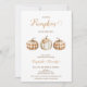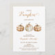 Pumpkin themed baby shower invitation in natural tones featuring three pumpkins, two being plaid and one with a floral arrangement. This little pumpkin baby shower invitation is ideal for an autumn or fall baby shower.