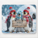 Three penguins stand together in the snow, wearing playful winter hats and scarves while holding a rustic wooden sign with fun text.