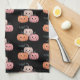 Elevate your Halloween decor with this charming kitchen towel featuring a delightful pattern of three super cute pumpkins in white, pink, and orange, along with a flying bat. Against the deep black background, the pumpkins and bat stand out, creating a playful and festive design that's perfect for the Halloween season.