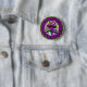 A button with three green and purple mushrooms against a lighter green and purple swirl background. The design is surrounded by dark purple floral motifs.
