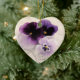 photo of purple and lavender-coloured pansies on a white cutwork fabric