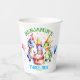 Three rex cute dinosaurs birthday party tableware personalised paper cups, cute three dinosaurs in party hats with a birthday cake confetti and balloons falling around for toddler small kids dinosaur themed birthday party.