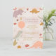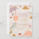 Three Rex dinosaur birthday invitation, 3rd birthday party invite designed for a fun and adventurous celebration. Featuring playful dinosaurs in mustard yellow, lavender and pink, this design is perfect for little girl dino lovers turning three.