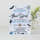 These fun and stylish invitations are perfect for anyone celebrating a 3rd birthday this Halloween. The design features everything spooky from a black cat with flying bats to a spider's cobweb, ghosts, a witches broomstick, skull & bone, magic glass ball and a jack-o-lantern pumpkin all in black, white and shades of blue colours. The template wording is easy to personalise and your party guests will be in for a scare when they receive these invites in the mail!