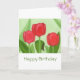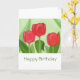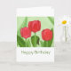 Three red tulips on the front of this birthday card. It says Happy Birthday, but the inside is blank. Use Zazzle text and fonts to have a message printed inside the card, or leave it blank and handwrite the message yourself!