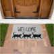 Three whimsical black cats walk across your doormat. Above the cat graphics the word WELCOME is printed in trendy black font. The background of the doormat is light grey. A fun carefree design that will welcome your friends and family to your home. If you prefer a different background color or a different message on your doormat you may use the on-screen tools to easily change the message and the color to match your decor. If you need help please contact me. I'll help you create your unique design!