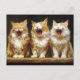 Three silly, cute, orange and white cats sitting on a wooden shelf with their mouths wide open singing the song of their people.
