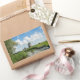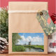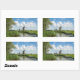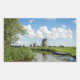 Rectangular photo sticker of three windmills along a canal with boats and reeds under a blue sky with puffy clouds creating a peaceful scene in the dutch countryside of Leidschendam, the Netherlands.