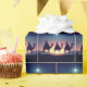Silhouetted against a starry night sky are three wise men journeying towards a bright star