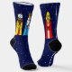 Three wise men in colourful clothes holding gifts and small snowflakes on navy blue Socks. Merry Christmas!