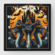 Three striking snakes, donning witch hats, slither ominously with a haunted castle backdrop, illuminated by a glowing full moon and flying bats.