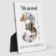 Commemorate your third year of marriage with our Three-Year Wedding Anniversary Photo Collage Tabletop Plaque with Easel. This elegant collage beautifully arranges 6 cherished photos in the shape of a number "3", allowing you to relive the special moments from each month of your journey as a married couple. Expertly printed on premium-quality material, the collage is designed with a sleek built-in easel for easy display on any tabletop or shelf. There is text that reads " We survived 3 years and our love is still strong". If you like, you can personalise this text with your own message instead.