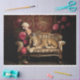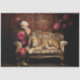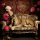 Amidst the opulence of a bygone era, a regal lion reclines upon an antique couch adorned with delicate pink florals. The deep red damask walls envelop the scene in a sense of timeless luxury, while a golden crown rests upon the beasts head a silent testament to its noble reign. In this moment of repose, power and elegance intertwine, capturing the essence of a ruler at rest. Perfect for art work or furniture.