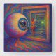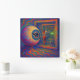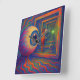 “Through the Prism of Sight”. Bathed in waves of vibrant colours of orange, red and blue, a woman stands barefoot at the edge of an infinite mirror tunnel. Colossal eyes gaze back endlessly, their reflections stretching beyond sight into the future. A smaller, misplaced eye rests on the floor, quietly reminding that perception is never flawless, and every vision carries its own distortions.
