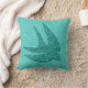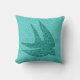 Throw pillow in a Mixed Media textile print of a swallow in flight, in a vintage Japanese cloud pattern against a swirl patterned background, in turquoise and soft aqua