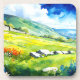 "Fielddale" Wide Landscape Yorkshire Dales Scene. A peaceful Yorkshire Dales scene unfolds in this stylised watercolour, with undulating hills and fields bordered by stone walls. Colourful meadow flowers enhance the tranquil, relaxed atmosphere, reflecting the charm of this English rural idyll.