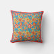 A Throw Pillow or Cushion with an allover pattern of red, orange, yellow flowers on a bright turquoise background, from a handpainted paper collage by Judy Adamson.