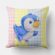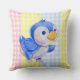 Throw pillow with cute blue bird on multi colour gingham background.