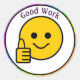Reward sticker with a cute round yellow face showing the thumbs up sign. He has two black dots for eyes and a happy smile. Above his head are the words "Good Work" in purple lettering. This is a template so you can change the message to your own if you wish.