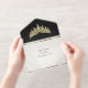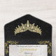 This elegant All In One foil Quinceanera Invitation features a gold tiara, and a leaf frame on an elegant black and white pearl background. "Quinceanera", the young lady's name and the design or in foil. Designed as coordinate with the "Floral & Gold Leaves - Black & Pearl" Quinceanera collection. To change details, click «Personalize». To move the text or change the text size, font, or color click «Click to customize further»