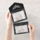 This elegant All In One foil Quinceanera Invitation features a silver tiara, and a leaf frame on an elegant black and white pearl background. "Quinceanera", the young lady's name and the design or in foil. Designed as coordinate with the "Floral & Gold Leaves - Black & Pearl" Quinceanera collection. To change details, click «Personalize». To move the text or change the text size, font, or color click «Click to customize further»