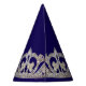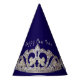 This party hat is shown in a deep blue background and a silver and pearl tiara print all the way around. Text in coordinating color of silver-gray states Happy New Year.