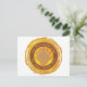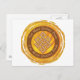 Endless Knot Buddhist design with yellow and orange circular grunge strokes with Om Mani Padme Hum in elegant surrounding text. In the inner brown circle is larger Om Mani Padme Hum text. In the centre with a backing of enlightened rays is an Endless Knot symbol, one of the Eight Auspicious Symbols of Buddhism.
