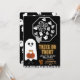 Our trick-or-treat Halloween invitation, sets of stickers and tags the stage for a hauntingly good time. Against a mysterious black base, a friendly white "Boo!" ghost cheerfully holds a trick-or-treat basket, while a playful crowd of small ghosts' dances around in excitement. This enchanting design promises a night filled with spooky fun and sugary delights. Join us for a thrilling and memorable Halloween celebration that's sure to leave you with a smile that's wider than any jack-o'-lantern!