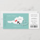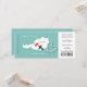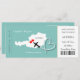 A fun but stylish wedding invitation in a boarding pass/ticket style for couples getting married abroad in Austria which is shown in a white map silhouette on teal blue with sweet red love hearts, air plane silhouette and white swirling heart shape. The reverse of the boarding pass has an editable photo template and along with space to put your wedding details.
