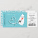 A fun but stylish wedding invitation in a boarding pass/ticket style for couples getting married abroad St Lucia which is shown in a white map silhouette on teal blue with sweet red love hearts, aeroplane silhouette and swirling heart shape. The reverse is easy to customise with your personal details and has a lovely white floral lace pattern.