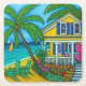 A painting by Lisa Lorenz of a vibrant, blissful tropical scene of a colourful cosy beach house along a turquoise seashore beach. Now available on a a set of coasters to liven up your Bar.